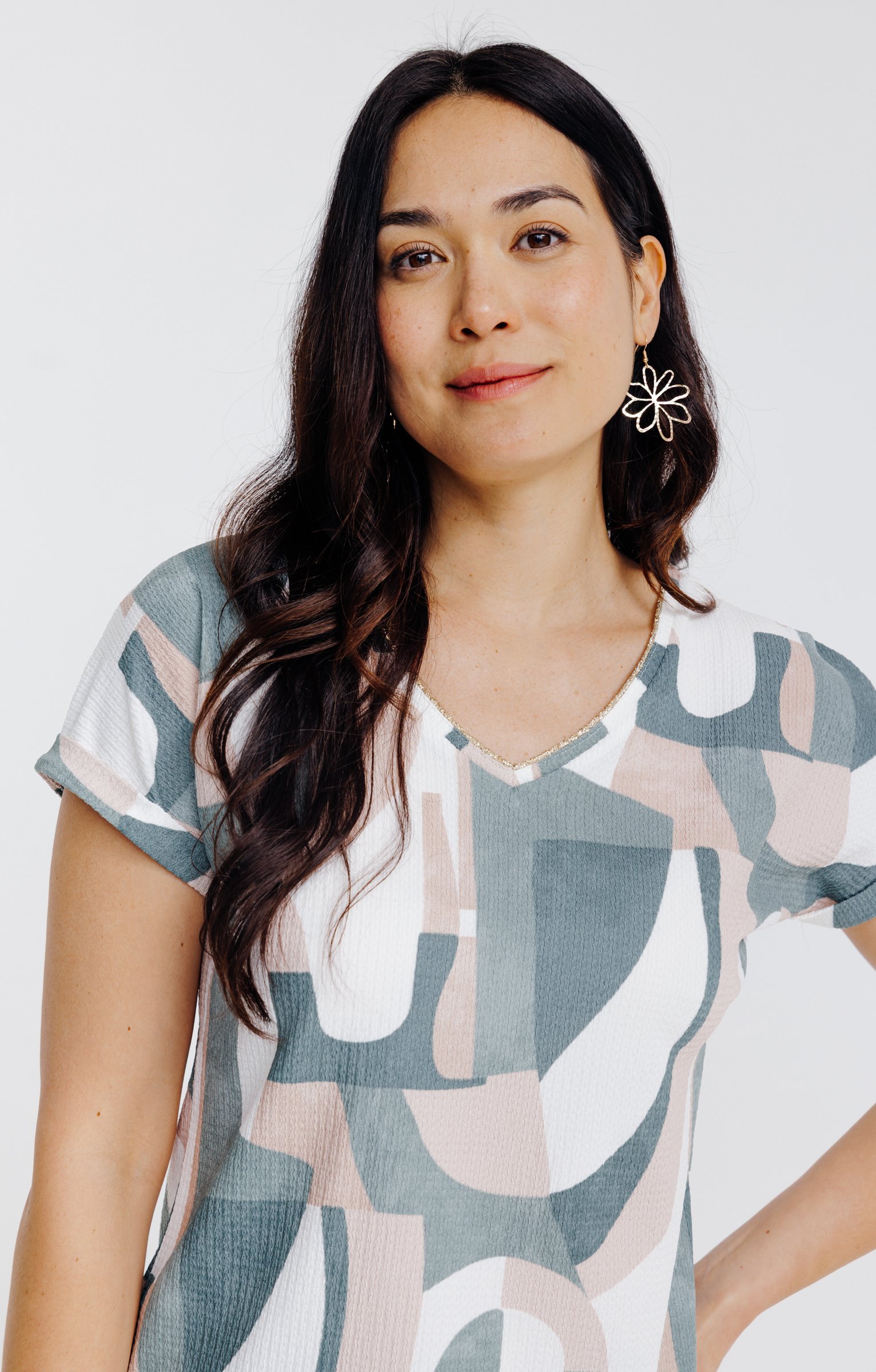 T-shirt en maille texturée imprimé graphique à manches courtes et col V. Coupe ajustée. Manches courtes. Bas des manches à revers. Col V avec parementure visible. Imprimé graphique. Tissu en maille chaude texturée. Matière extensible. Passepoil métallisé en finition du col. Base droite avec fines surpiqûres discrètes.