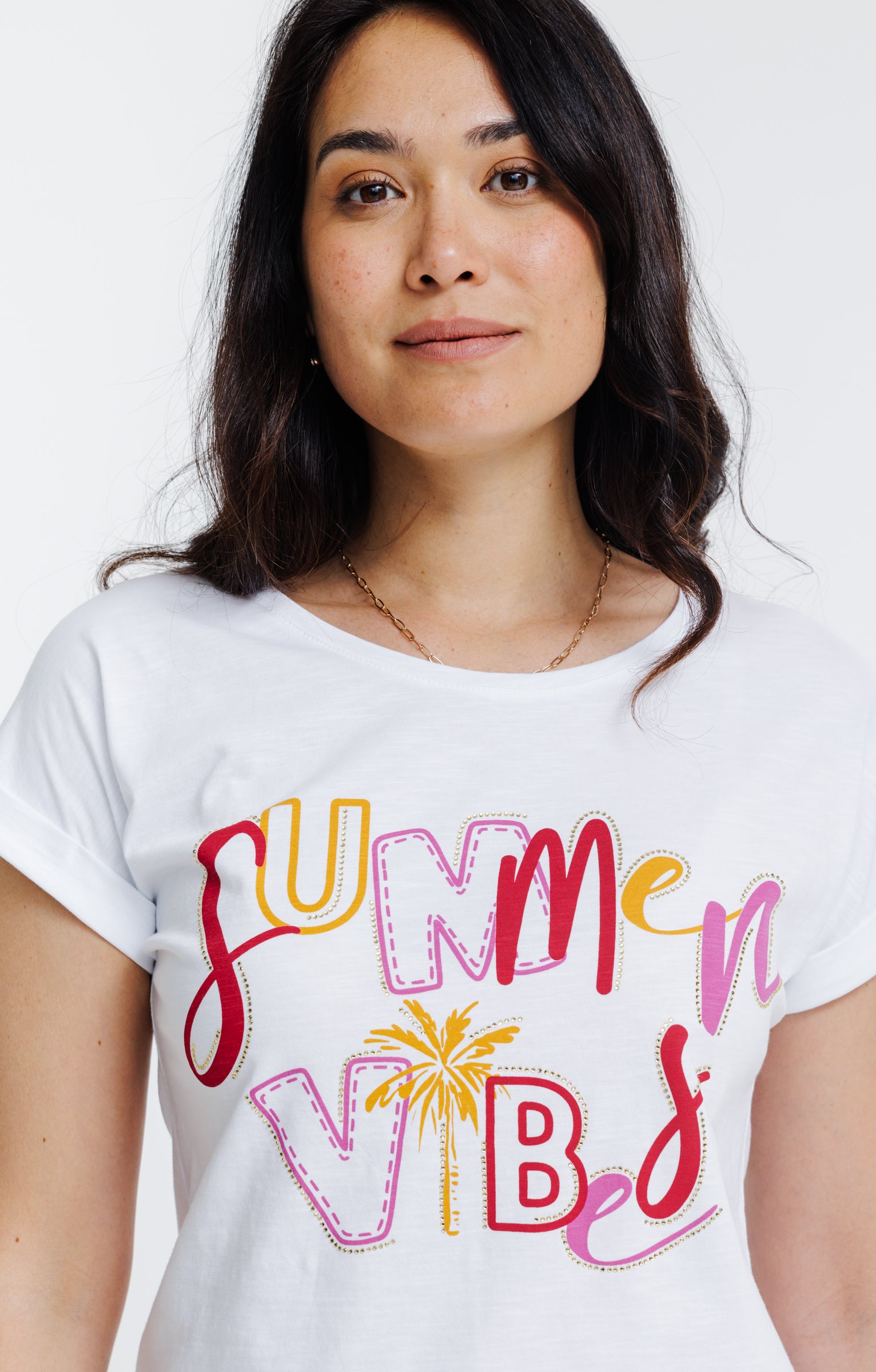 T-shirt à manches courtes avec col rond. Coupe droite. Imprimé Summer Vibes sur le devant, agrémenté de détails en strass. Nouette en bas du vêtement côté gauche. Longueur standard. Finitions des manches retroussées.