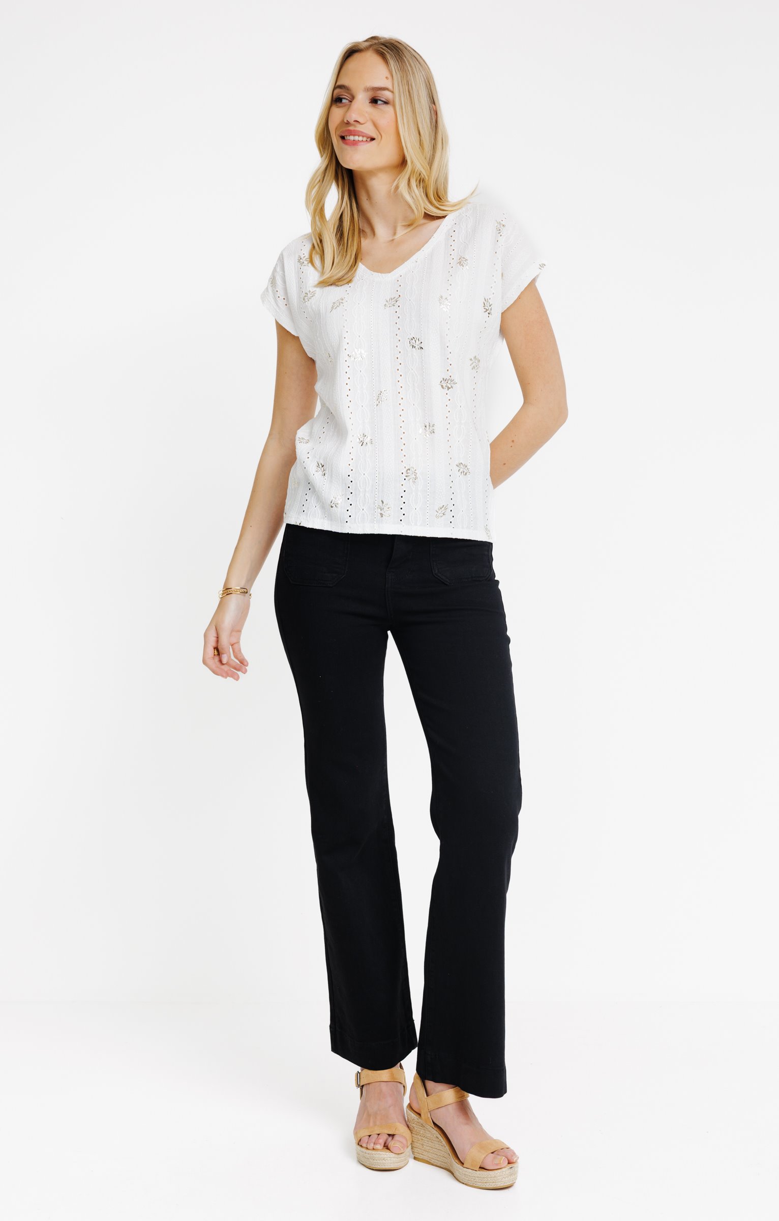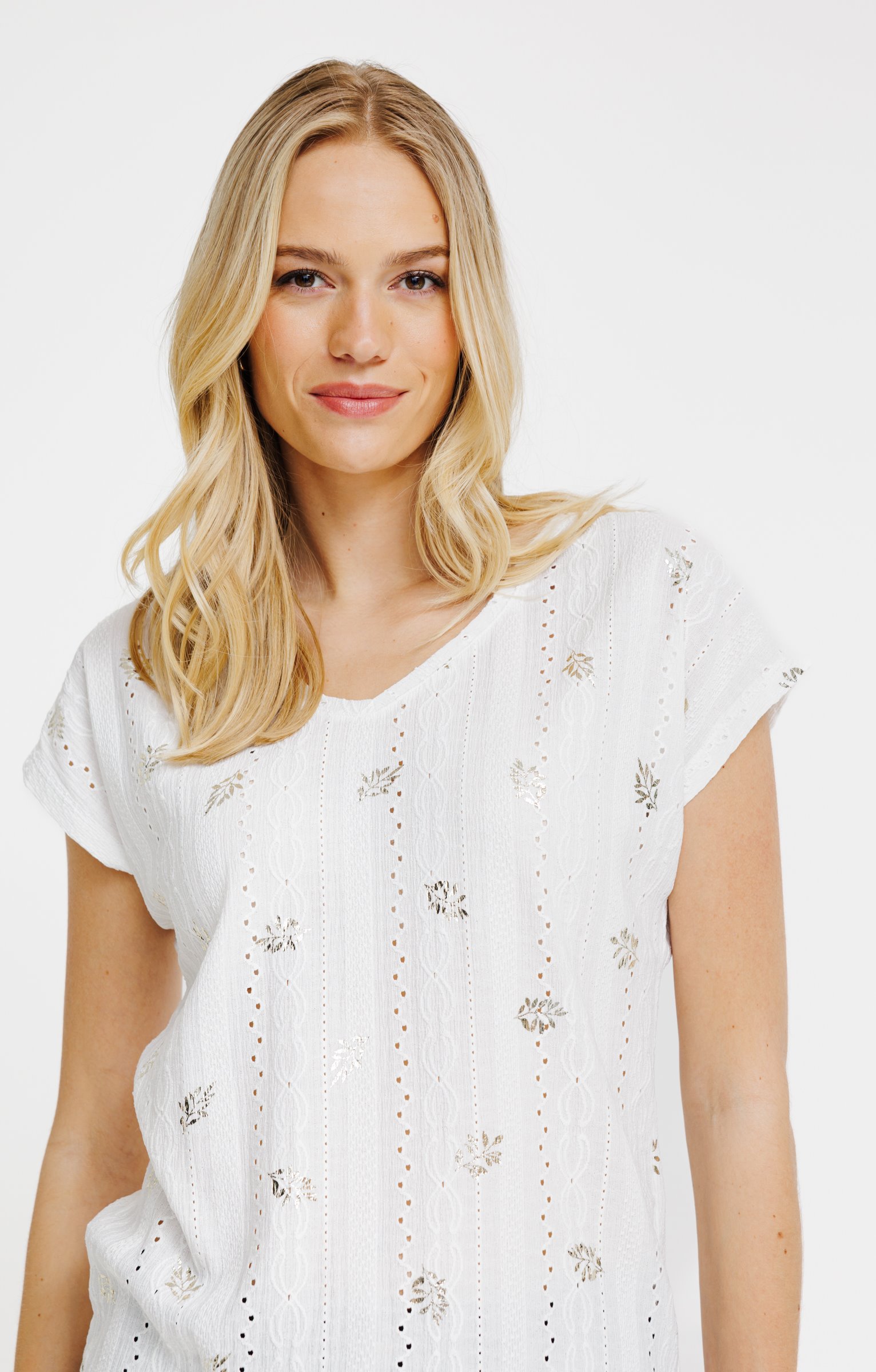 T-shirt à manches courtes avec col en V. Coupe droite. Détails en broderie et feuillage brillant imprimé sur l'ensemble du modèle. Longueur standard. Finition des bords avec un ourlet simple.