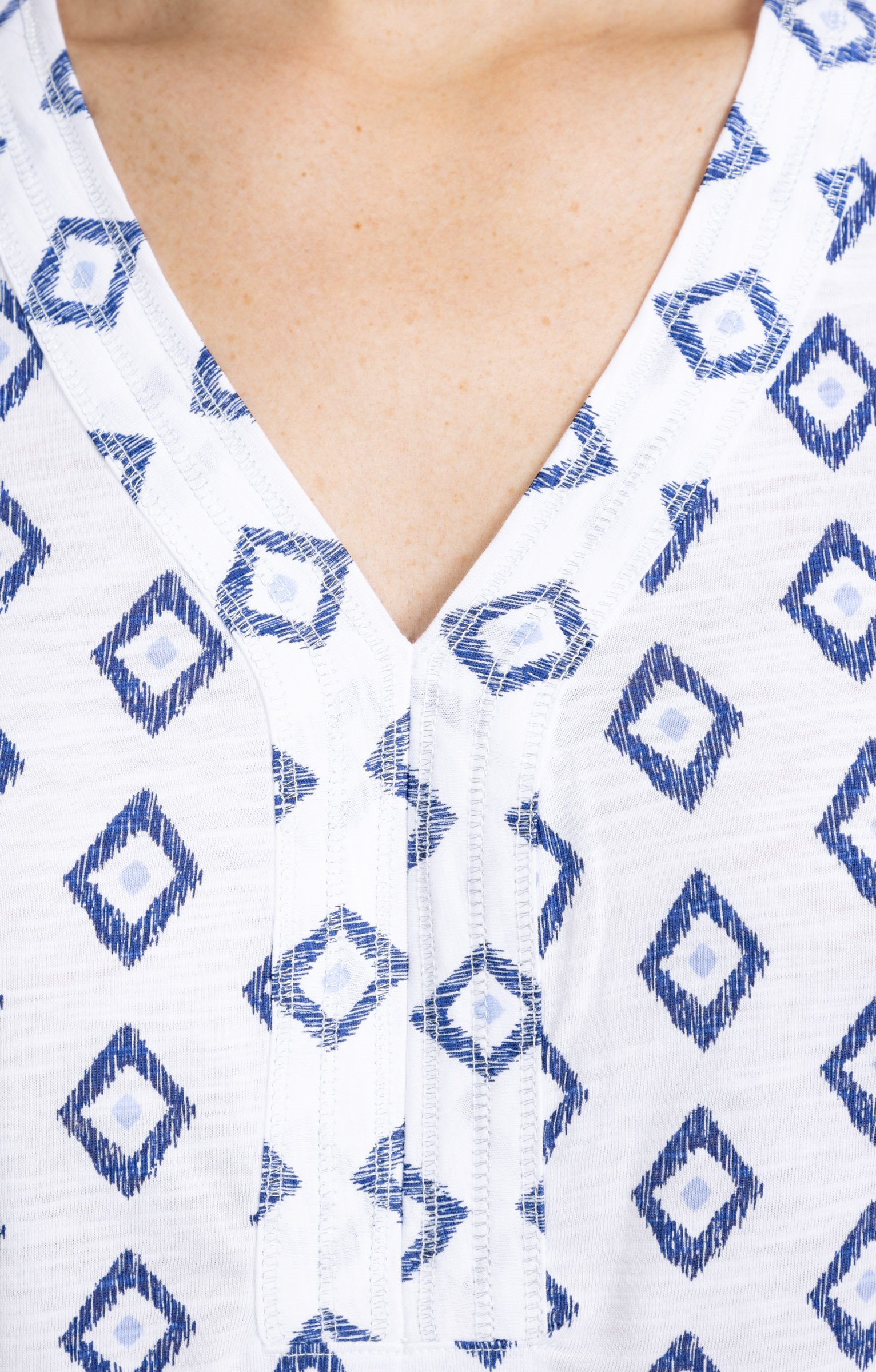 T-shirt à manches courtes imprimé graphique et détails métallisés au col. Coupe délicatement ajustée. Manches courtes. Sans emmanchures. Décolleté V. Motifs points au centre de losanges hachurés imprimés en tons multicolores. Maille jersey. Finition col et effet patte par surpiqûres en fils métallisé. Base droite. Composition 100 % coton biologique.