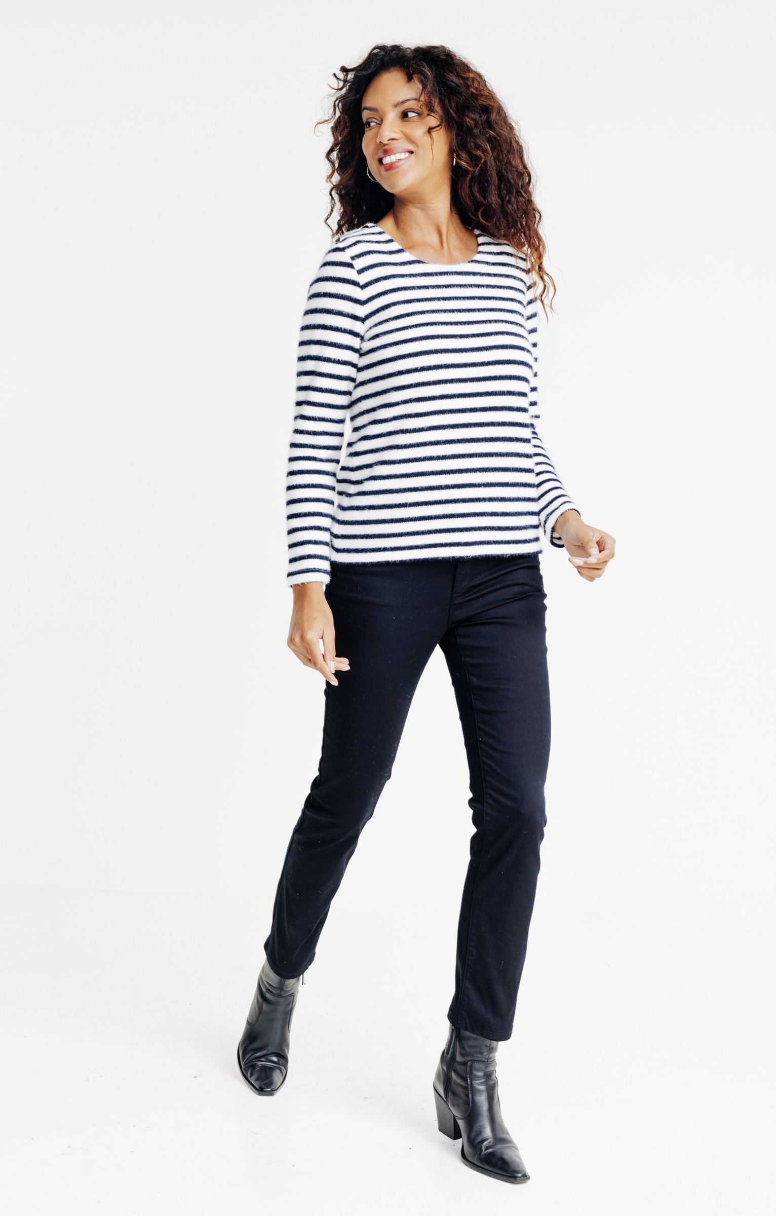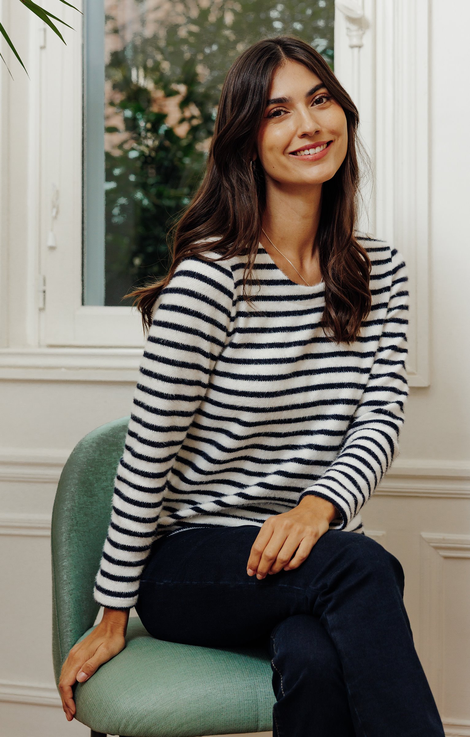 "T-shirt en maille poilue rayée à manches longues et col rond avec détails boutons. Coupe droite. Manches longues légèrement fuselées. Col rond. T-shirt à rayures façon marinière. Tissu en maille chaude poilue. 2 boutons sur chaque ligne d'épaule. Boutons cœurs aux finitions dorées. Base droite.