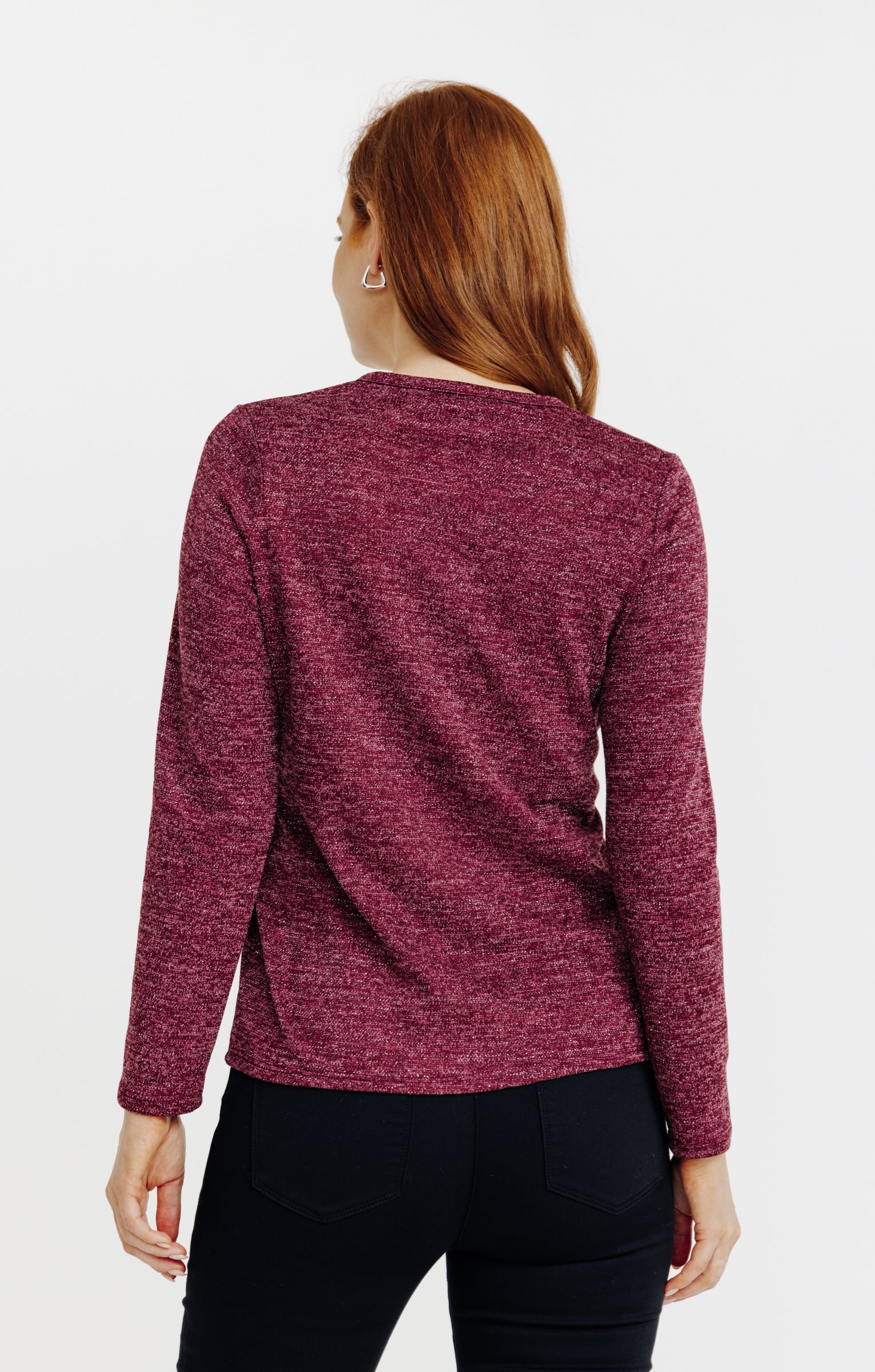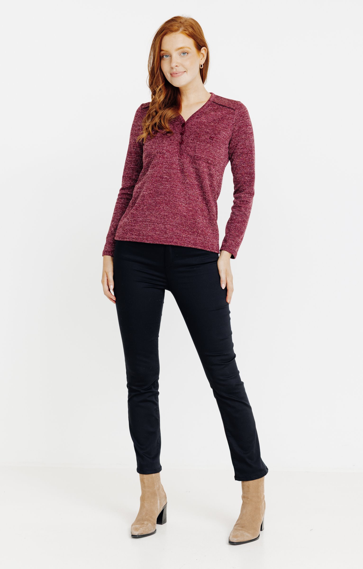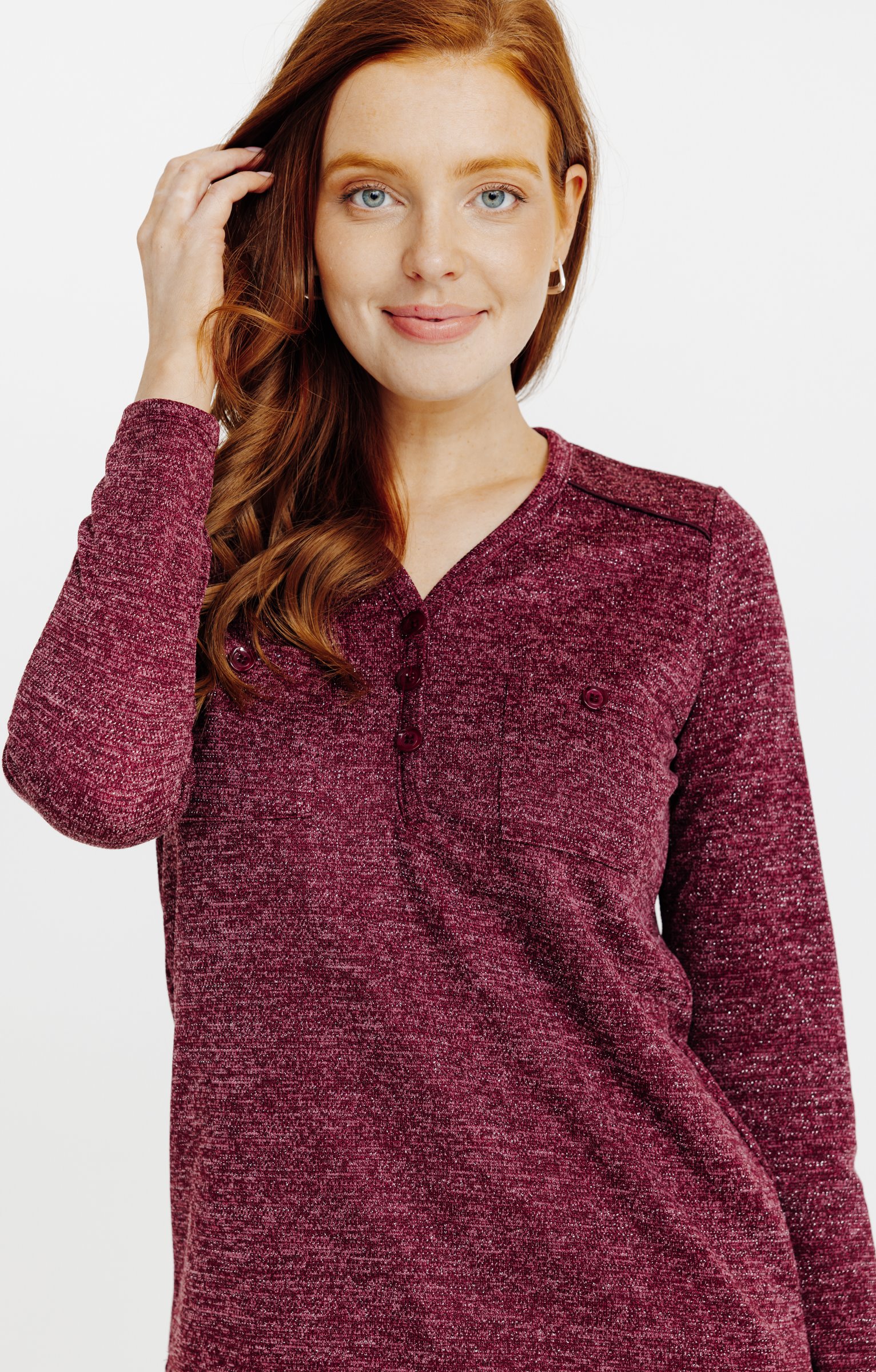 T-shirt droit à manches longues et col en V. Fermeture partielle par fausse patte boutonnée sur le devant. Deux poches poitrine plaquées avec rabat boutonné. Maille chinée bicolore avec effet légèrement pailleté. Longueur standard.