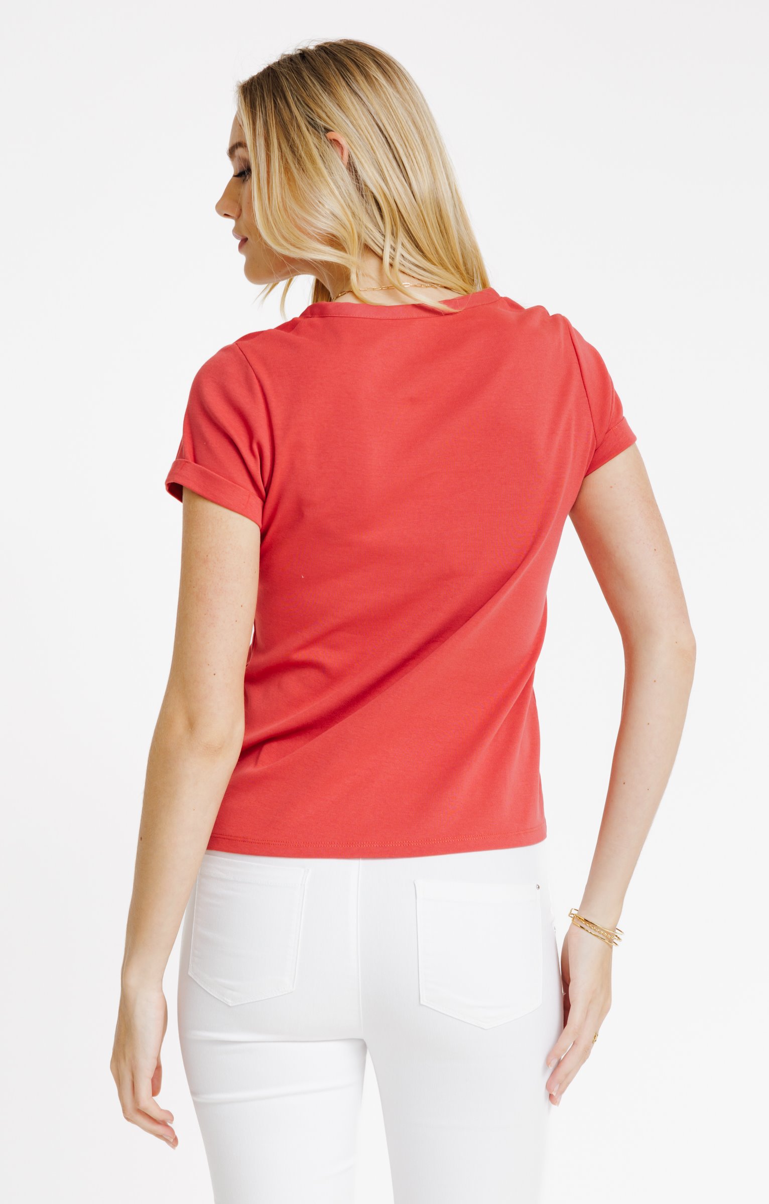 Notre mannequin Bérengère mesure 1m76 et porte un t-shirt taille 1.