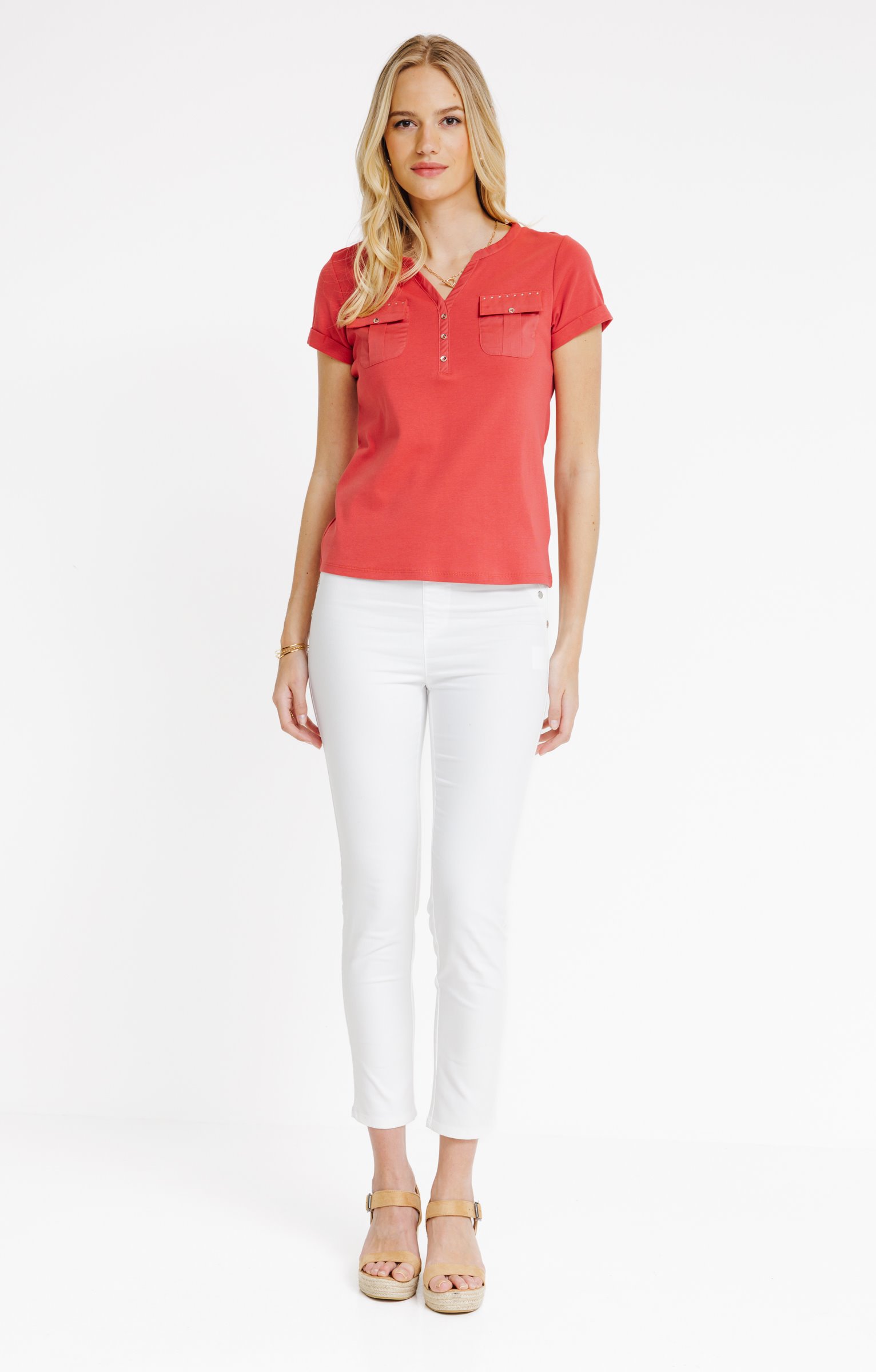 T-shirt à manches courtes avec col mao. Coupe droite. Deux poches plaquées à rabat boutonnées sur la poitrine, ornées de petits strass. Fausse patte de trois boutons sur le devant. Coloris uni. Finition des bords soignée.