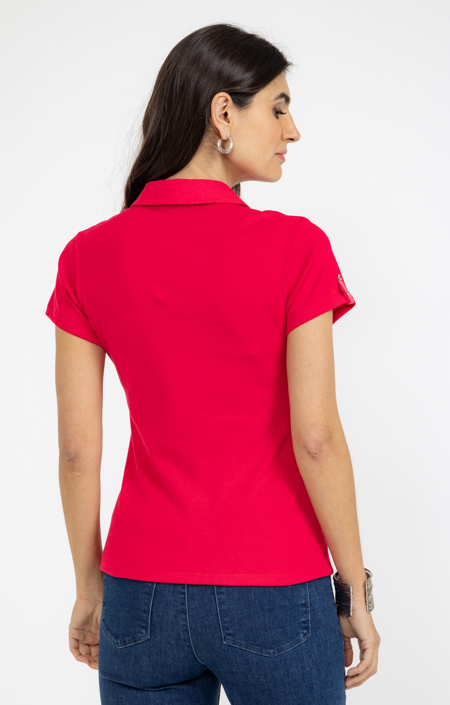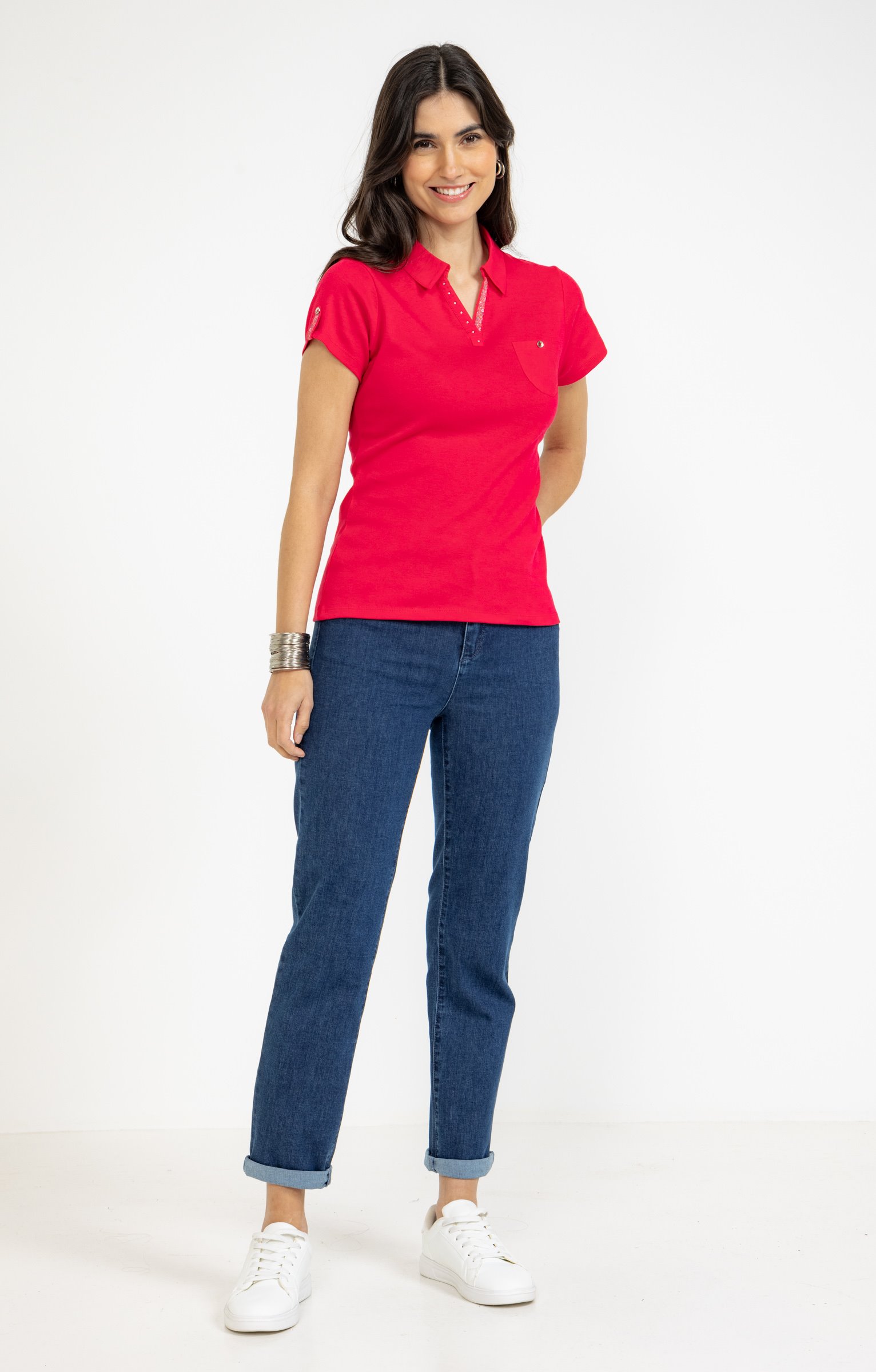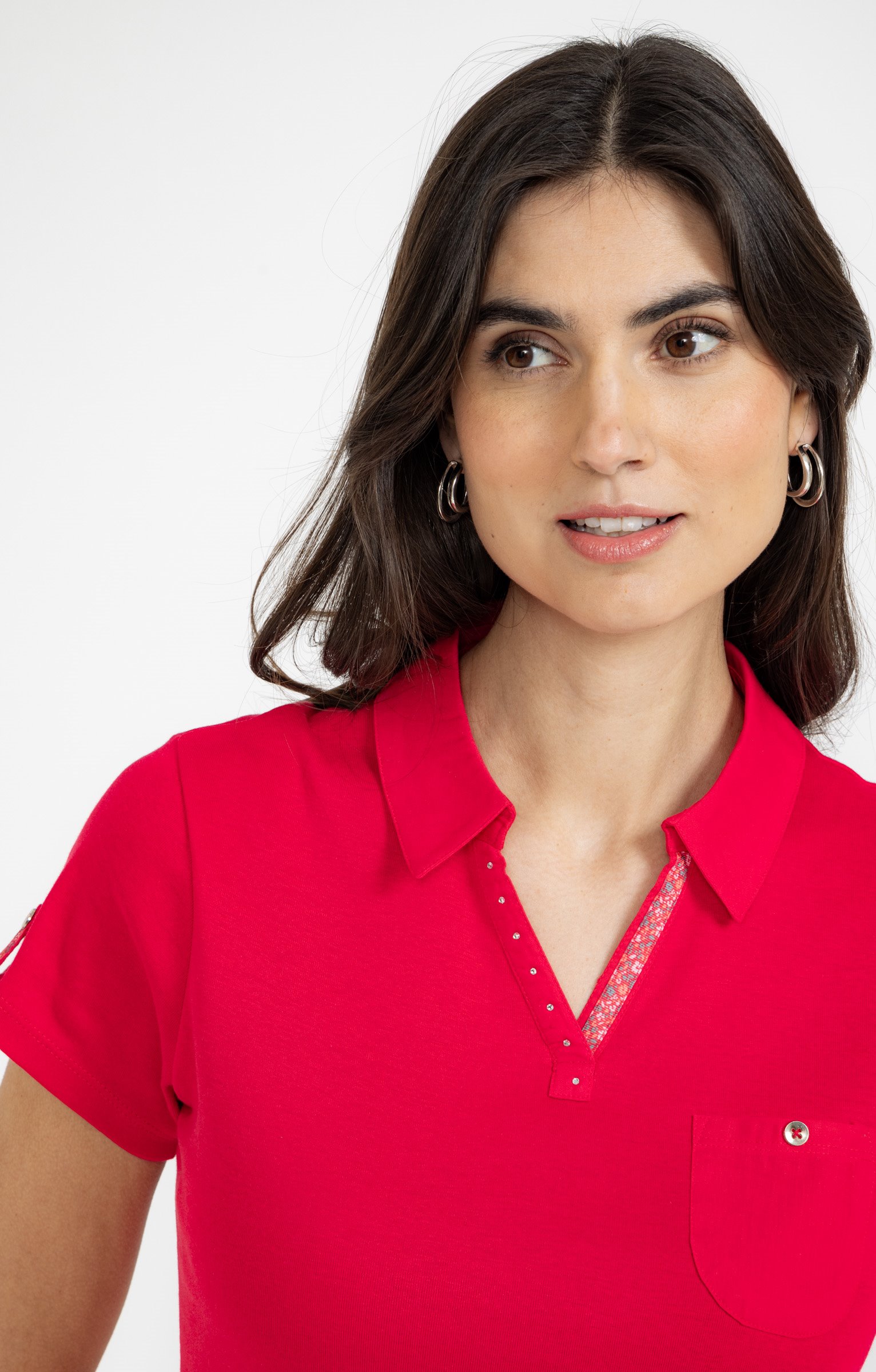 T-shirt à manches courtes avec col polo. Coupe droite. Col polo avec strass. Une poche plaquée sur le devant avec bouton décoratif. Détails fleuris sur le col et la patte retroussable au niveau des manches. Coloris uni. Longueur standard.