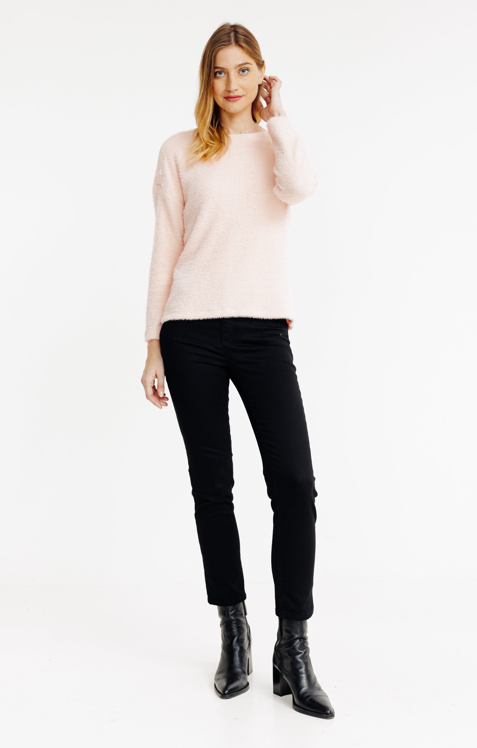 T-shirt uni à manches longues en maille duveteuse. Coupe droite. Col rond avec finition contrastante. Épaules boutonnées avec trois boutons métalliques plats sur chaque épaule. Longueur standard. Finition bord franc à la base et aux poignets.