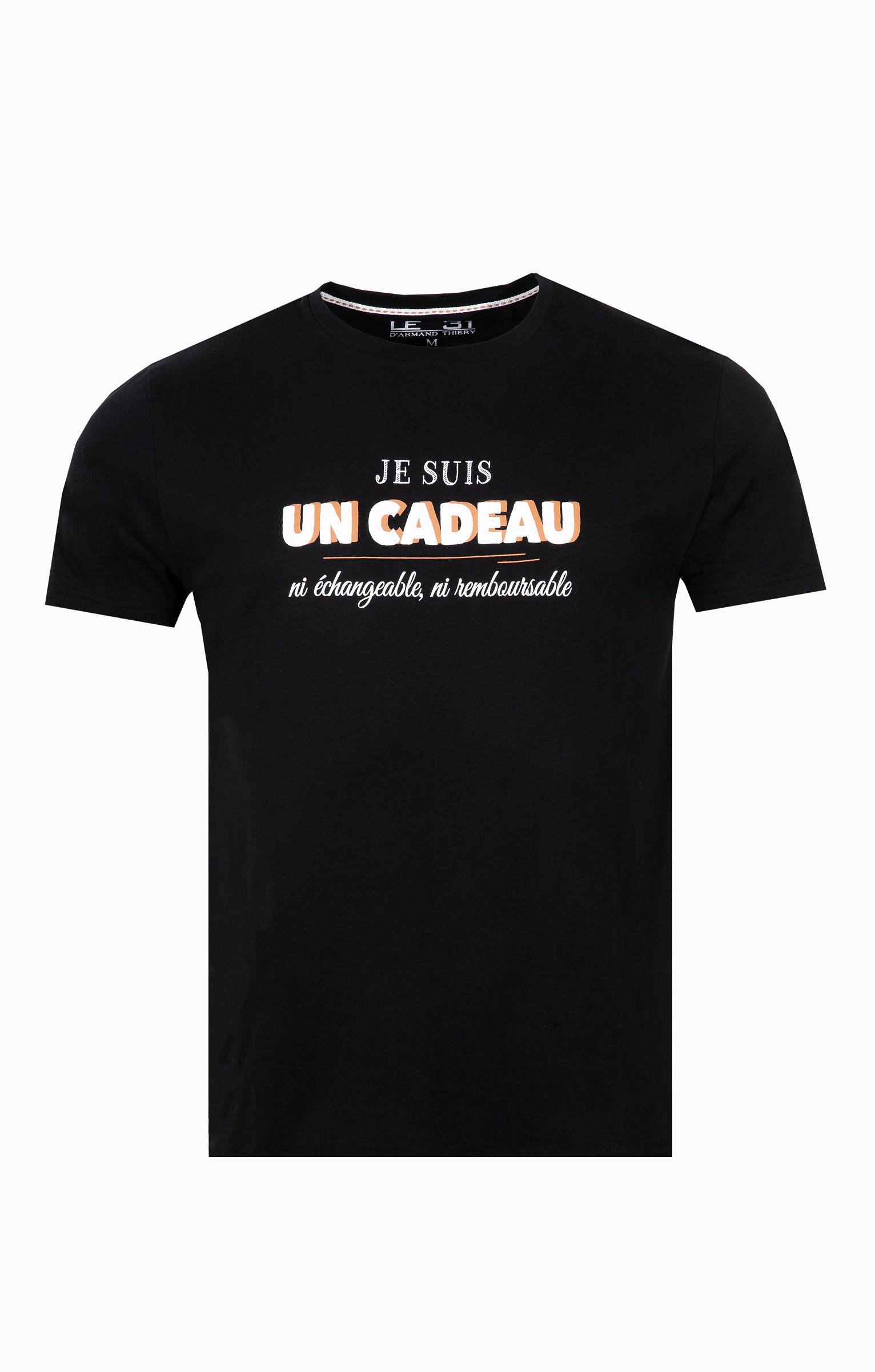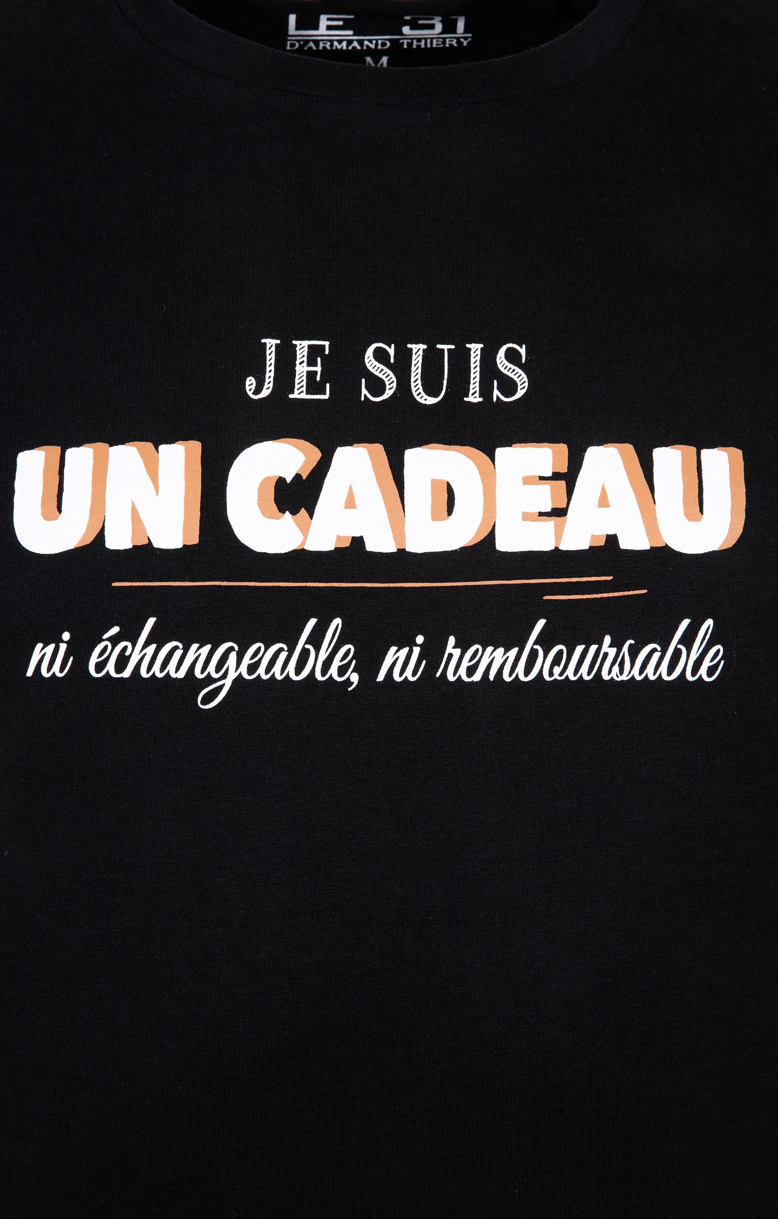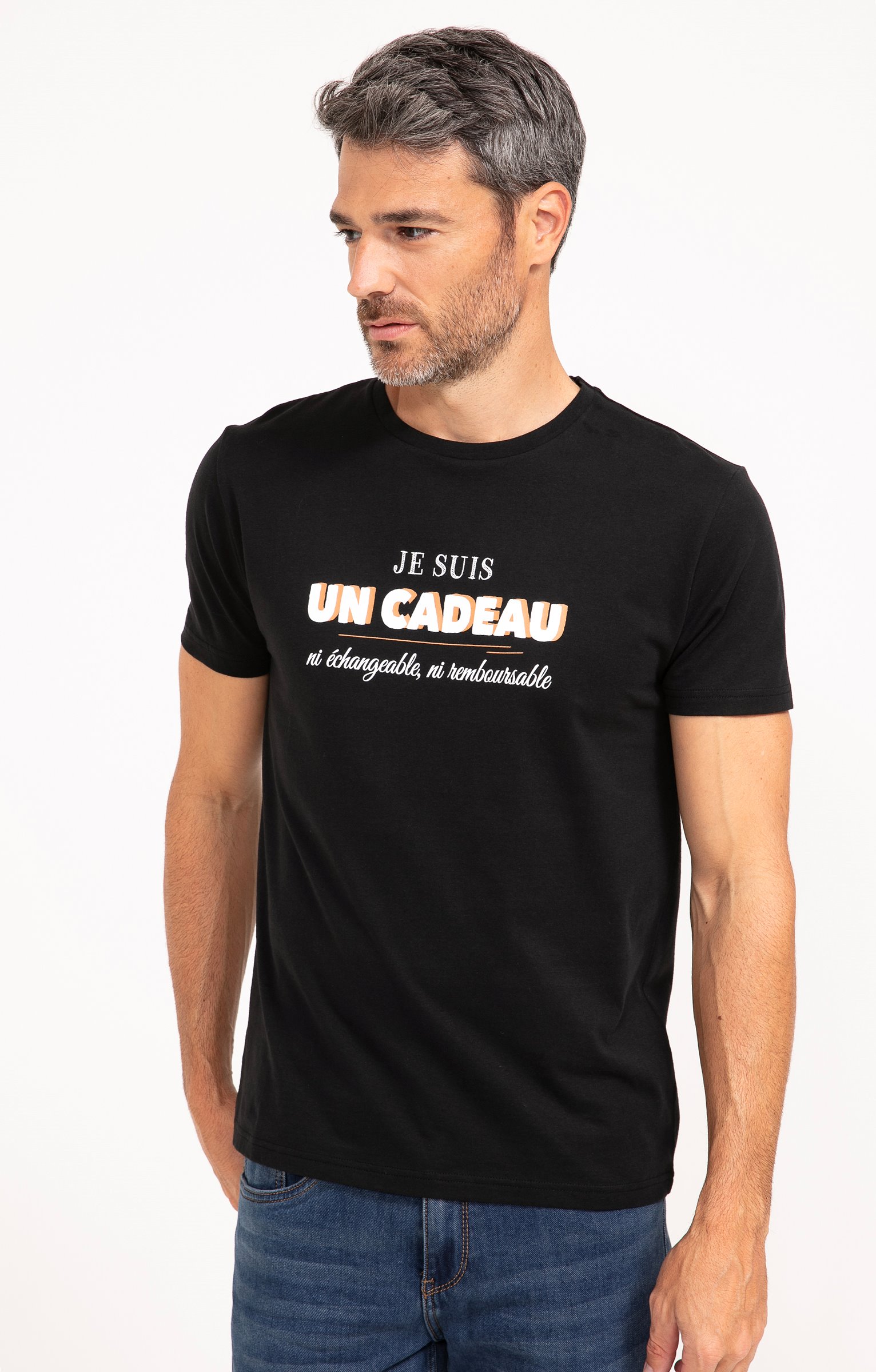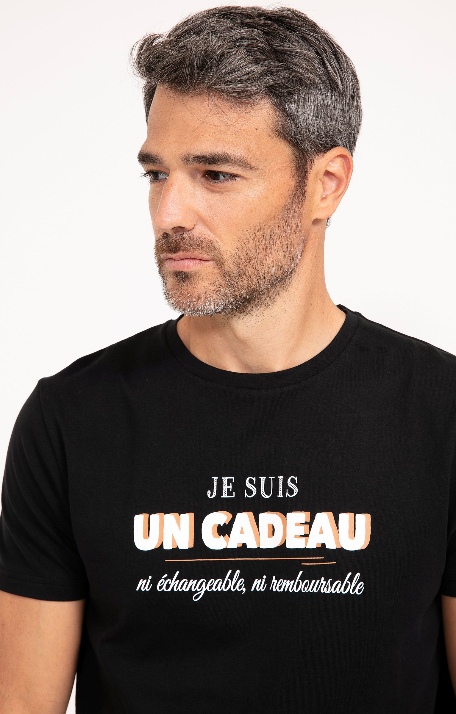 T-shirt à message humoristique à manches courtes et col rond. Coupe droite. Manches courtes. Col rond avec parementure visible. Message « Je suis un cadeau ni échangeable, ni remboursable » imprimé sur la poitrine. Motif contrastant bicolore. Mix typographies avec petit détail graphique. Tissu jersey. Fines surpiqûres ton sur ton en finition du modèle. Base droite.