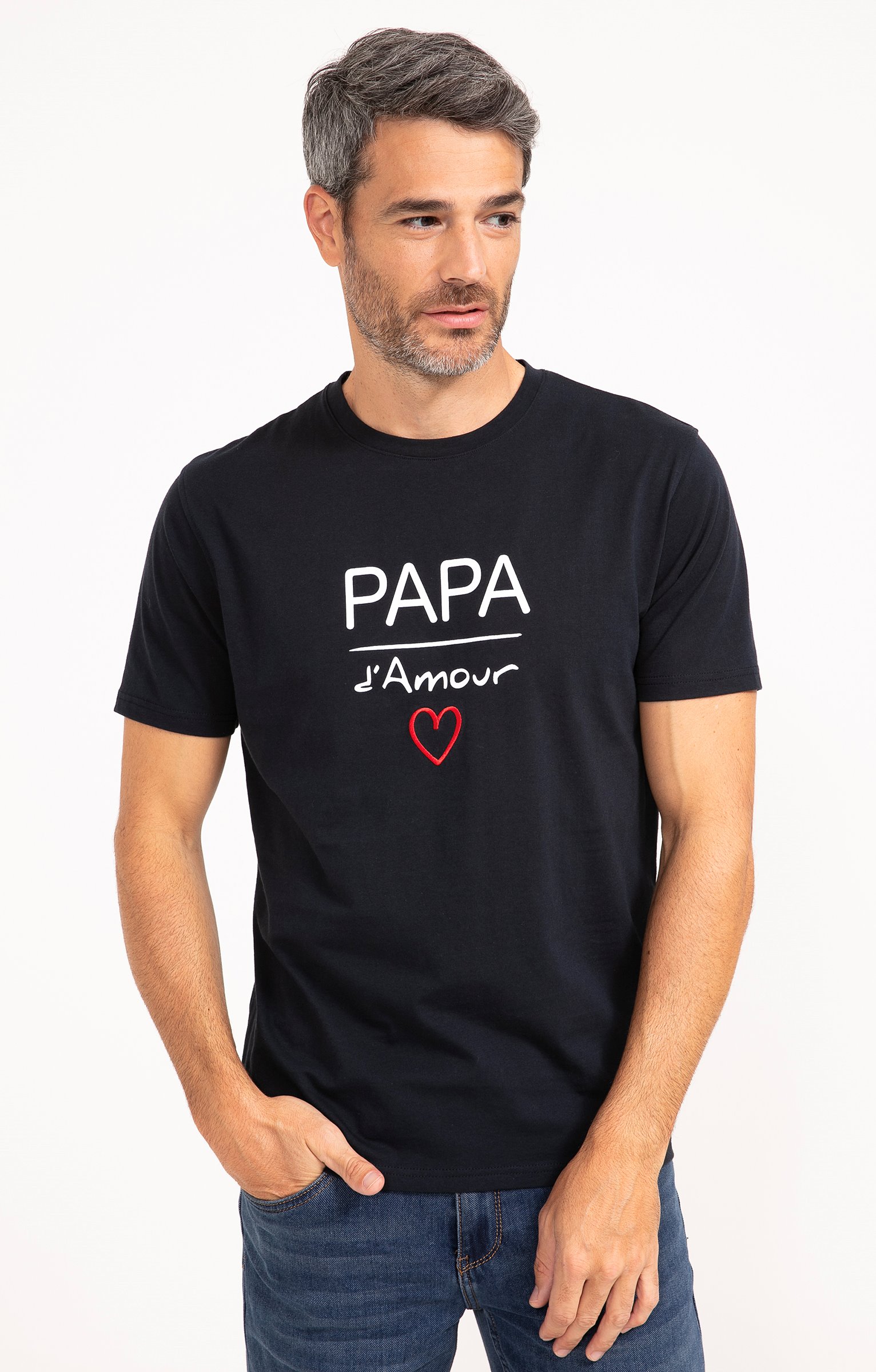 T-shirt à manches courtes et col rond avec détail brodé. Coupe droite. Manches courtes. Col rond avec parementure visible. Message contrastant « Papa d'amour » imprimé sur la poitrine. Détail cœur contrastant brodé. Tissu jersey. Fines surpiqûres ton sur ton en finition du modèle. Base droite.