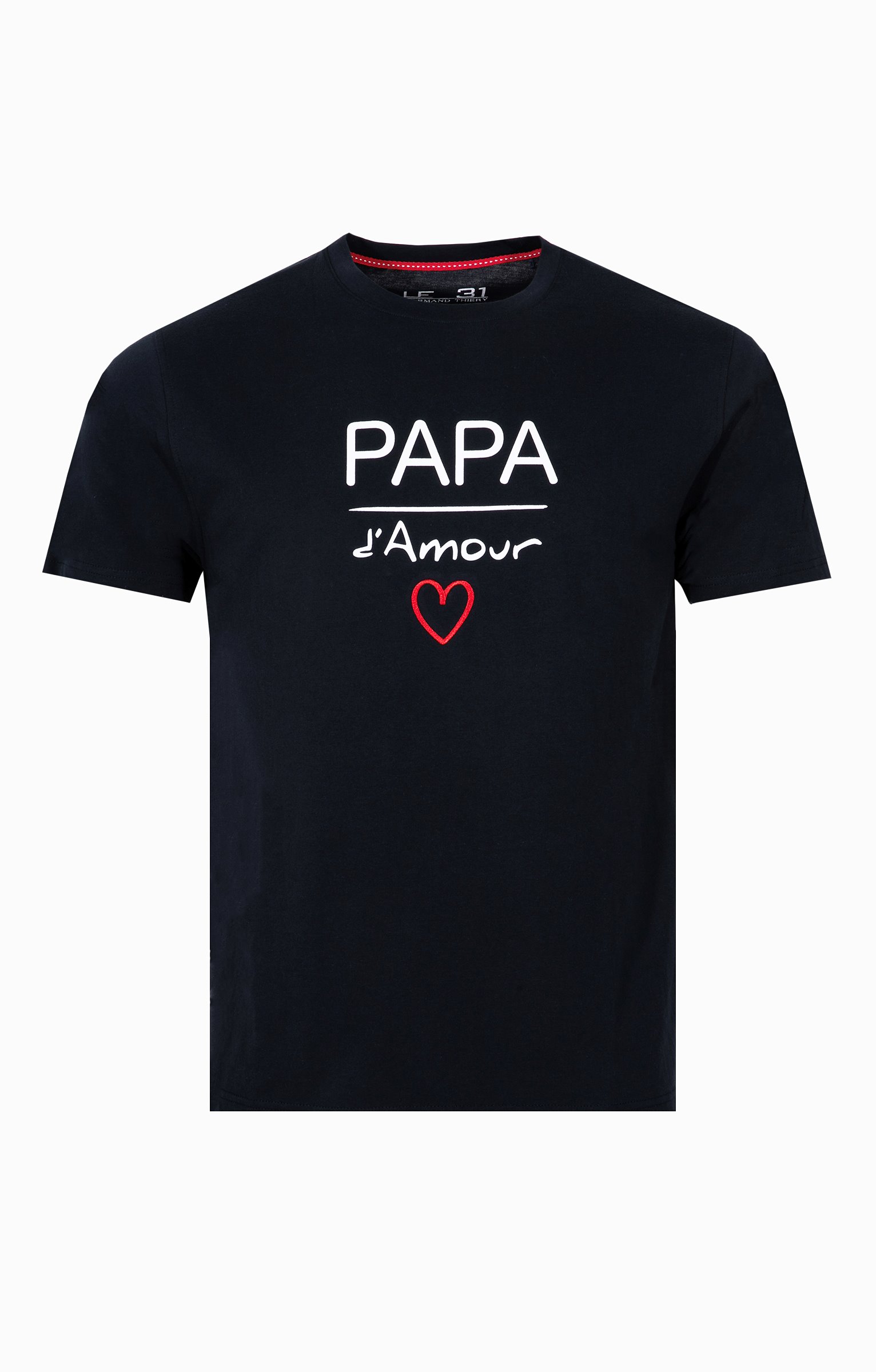 T-shirt à manches courtes et col rond avec détail brodé. Coupe droite. Manches courtes. Col rond avec parementure visible. Message contrastant « Papa d'amour » imprimé sur la poitrine. Détail cœur contrastant brodé. Tissu jersey. Fines surpiqûres ton sur ton en finition du modèle. Base droite.