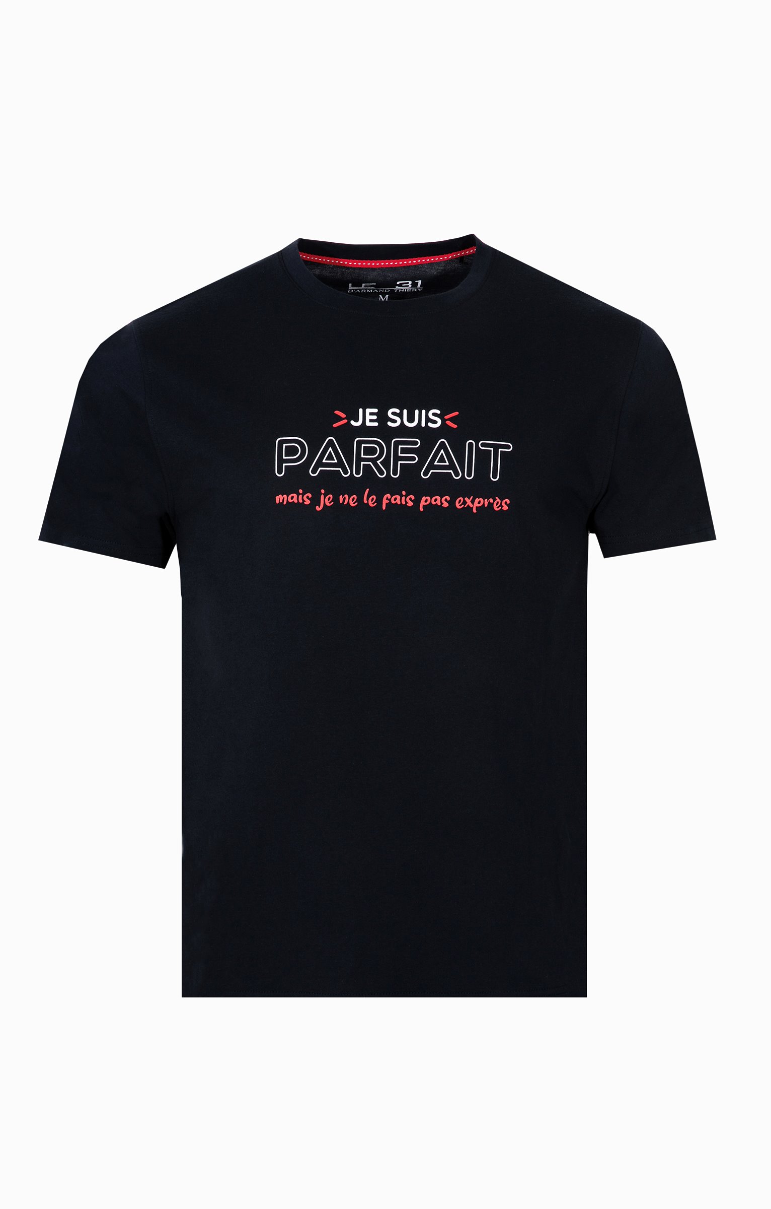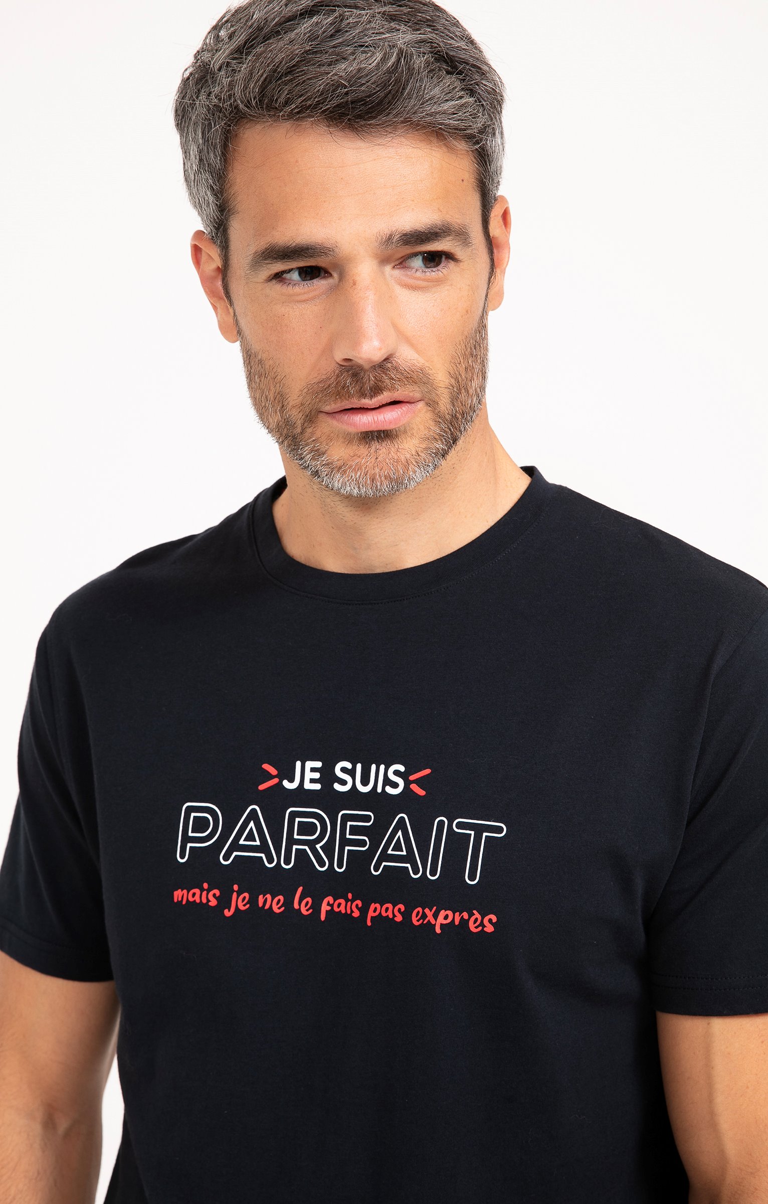 T-shirt avec message à manches courtes et col rond. Coupe droite. Manches courtes. Col rond avec parementure visible. Message placé « Je suis parfait mais je ne le fais pas exprès » imprimé sur la poitrine. Motif bicolore avec mix typographies. Tissu jersey. Fines surpiqûres ton sur ton en finition du modèle. Base droite.