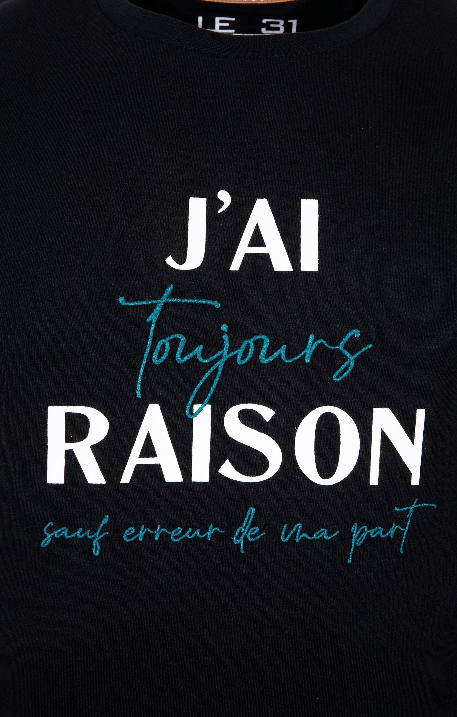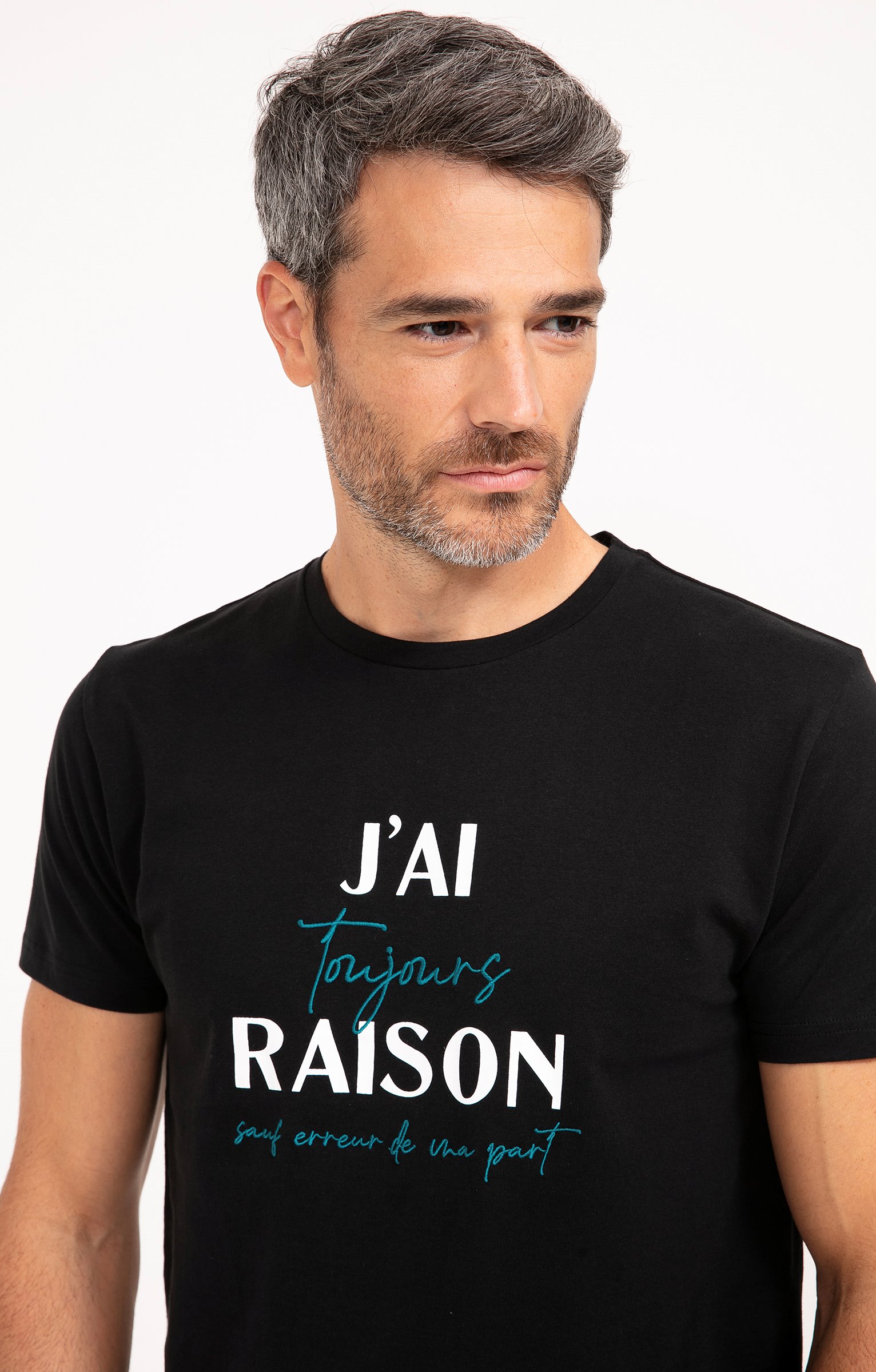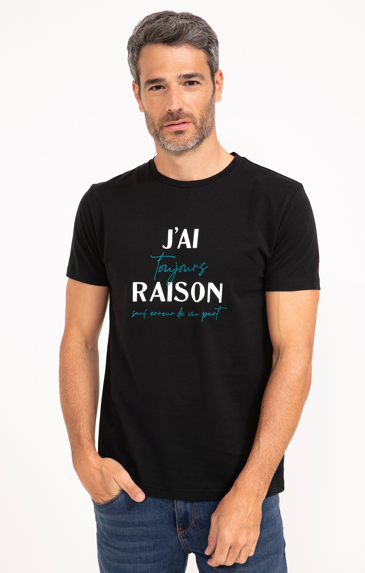 T-shirt humoristique à message placé à manches courtes et col rond. Coupe droite. Manches courtes. Col rond. Message « J'ai toujours raison sauf erreur de ma part » placé sur la poitrine. Motif bicolore imprimé et brodé. Mix typographies. Tissu jersey. Parementure visible. Fines surpiqûres ton sur ton en finition du modèle. Base droite.