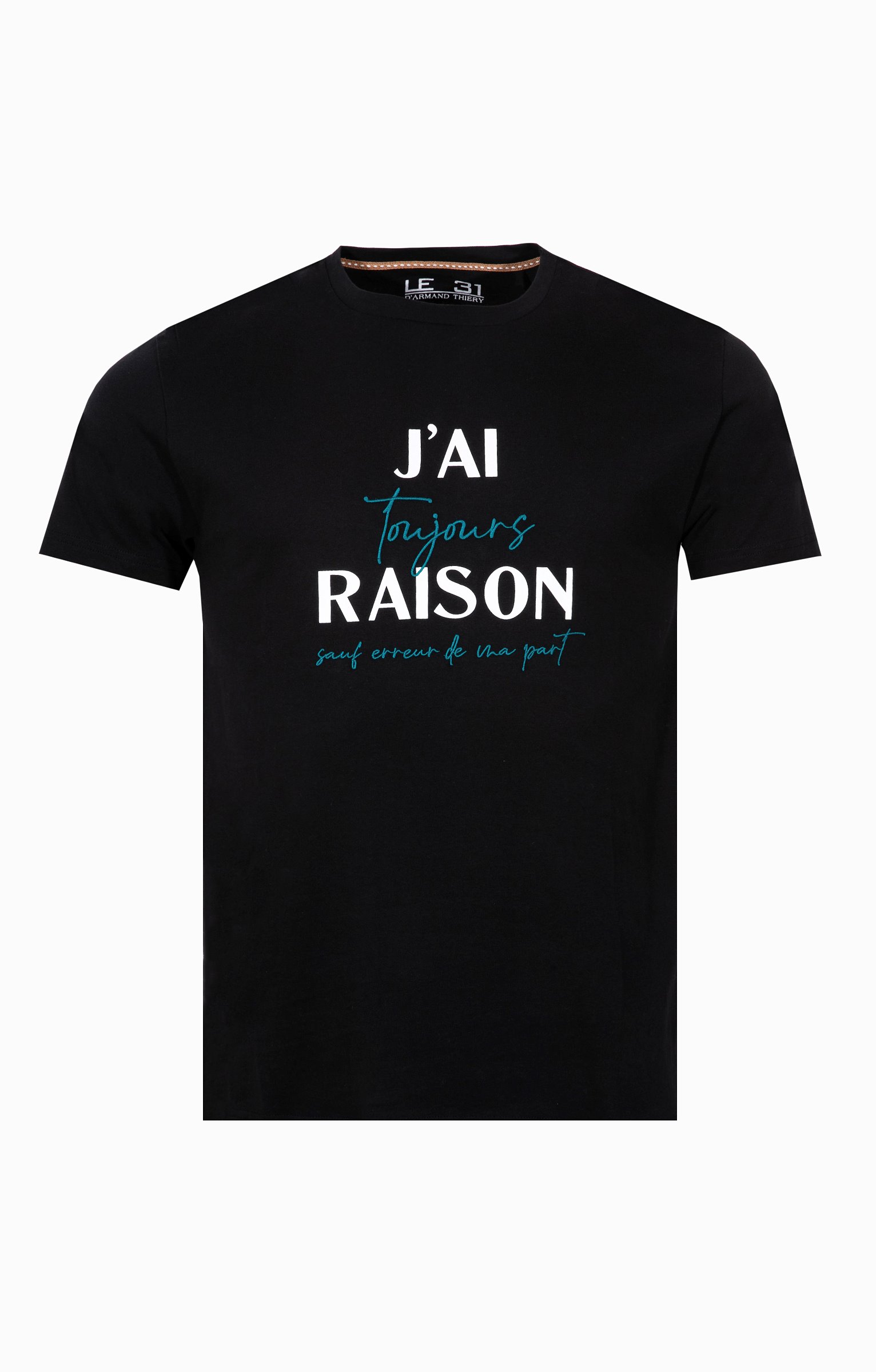 T-shirt humoristique à message placé à manches courtes et col rond. Coupe droite. Manches courtes. Col rond. Message « J'ai toujours raison sauf erreur de ma part » placé sur la poitrine. Motif bicolore imprimé et brodé. Mix typographies. Tissu jersey. Parementure visible. Fines surpiqûres ton sur ton en finition du modèle. Base droite.