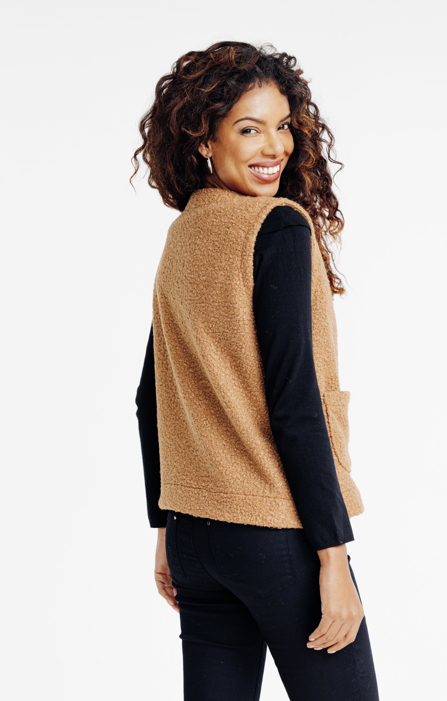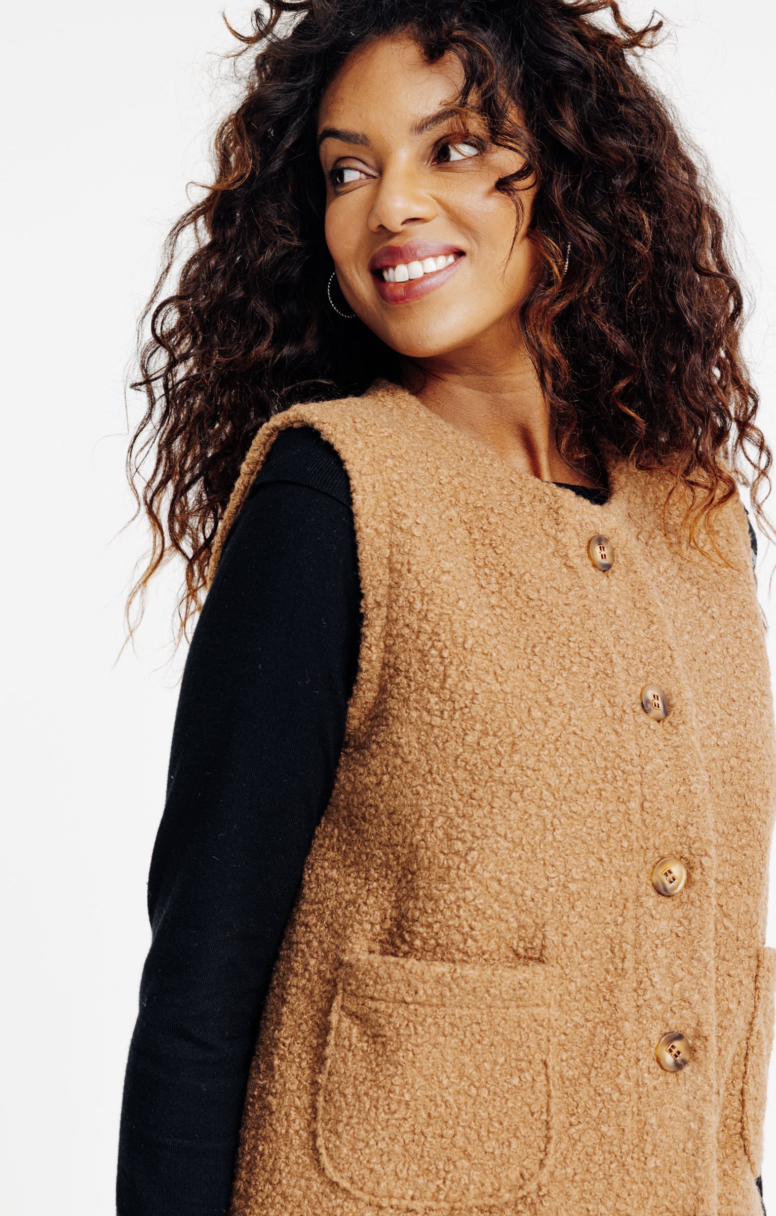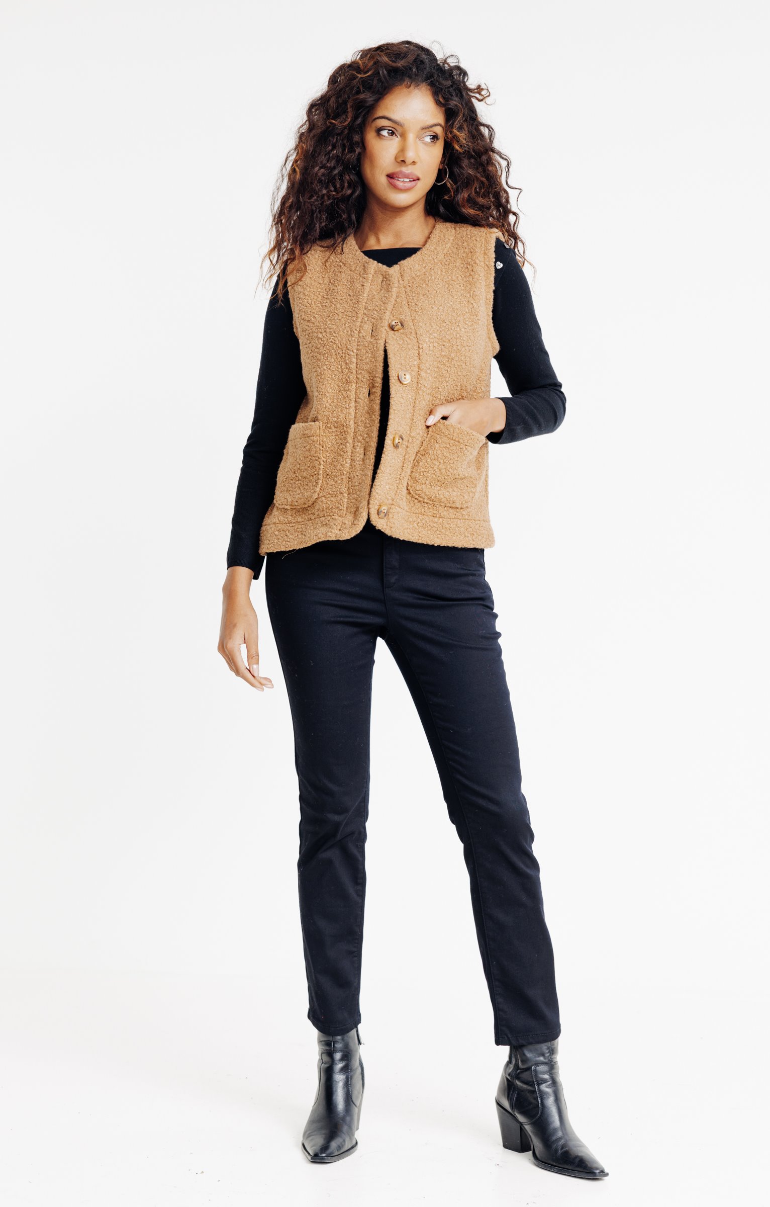 Gilet droit sans manches en tissu bouclette. Col rond. Fermeture boutonnée sur le devant avec boutons ronds à quatre trous. Deux poches plaquées à l'avant. Longueur standard. Coloris uni.
