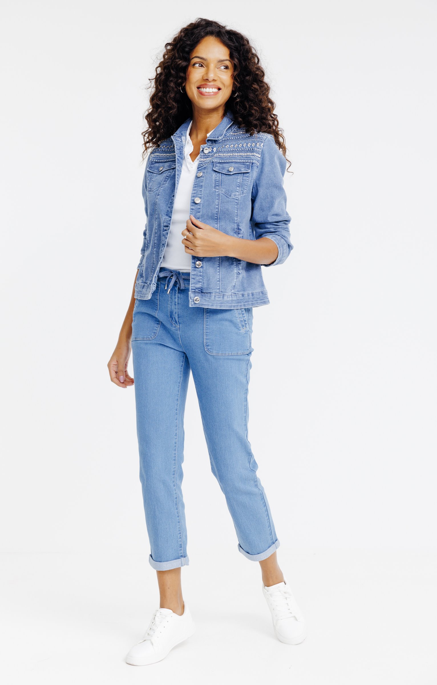 Veste en denim à manches longues. Coupe ajustée avec col chemise. Fermeture par boutons sur le devant. Deux poches poitrine à rabat et broderies décoratives sur les épaules. Longueur standard. Détails en surpiqûres contrastantes.