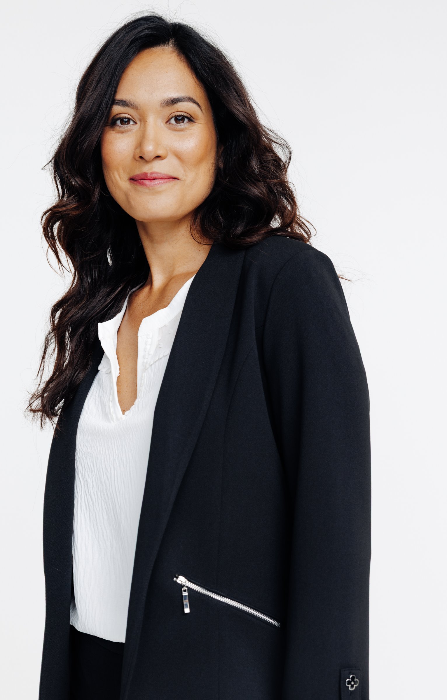 Notre mannequin Bérengère mesure 1m76 et porte une veste taille 36.