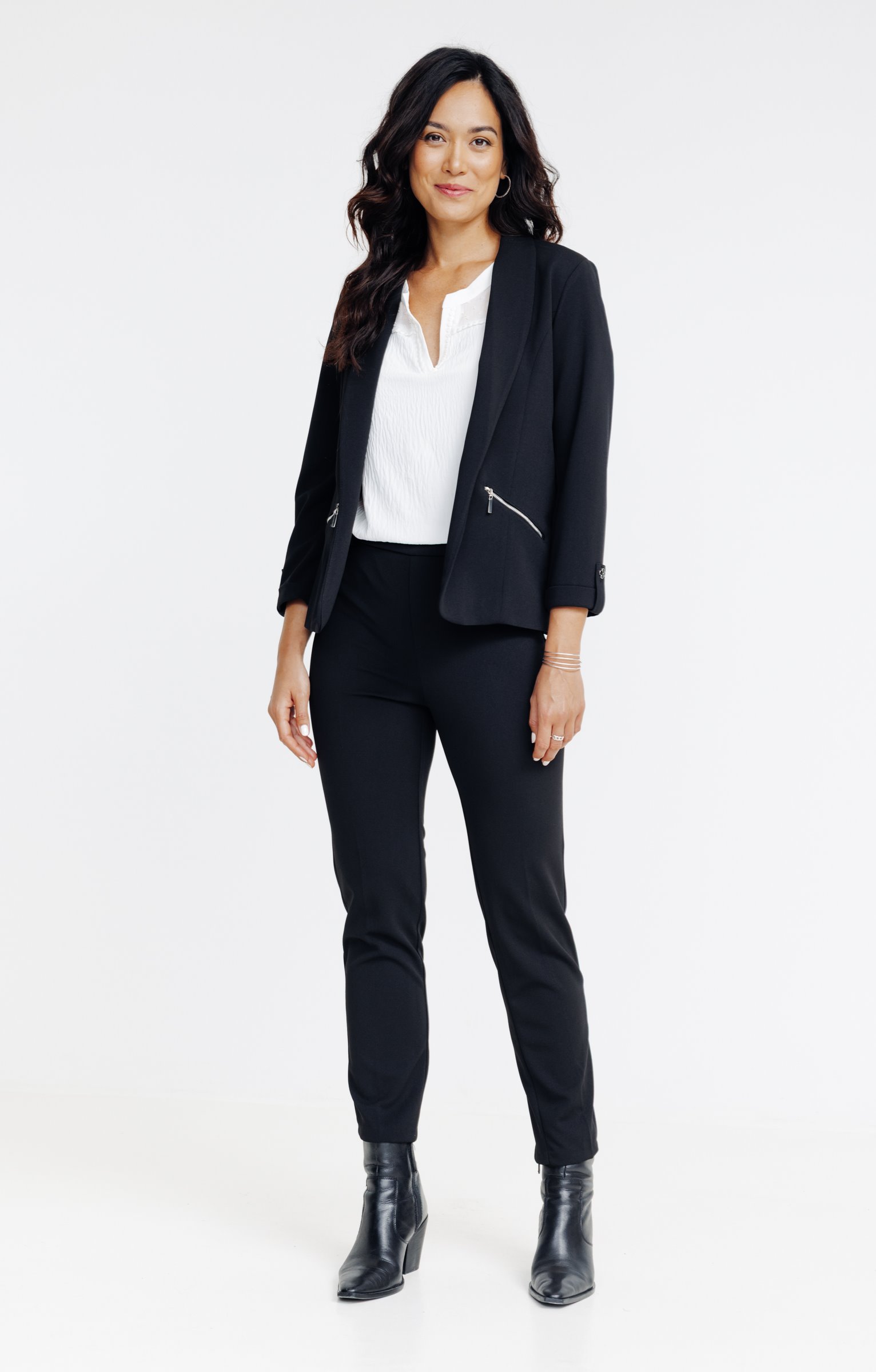 Veste courte unie à col châle. Coupe droite. Manches longues avec patte décorative boutonnée de fleur au bas. Fermeture boutonnée. Détail de zip métallique rectangulaire de chaque côté. Longueur standard.